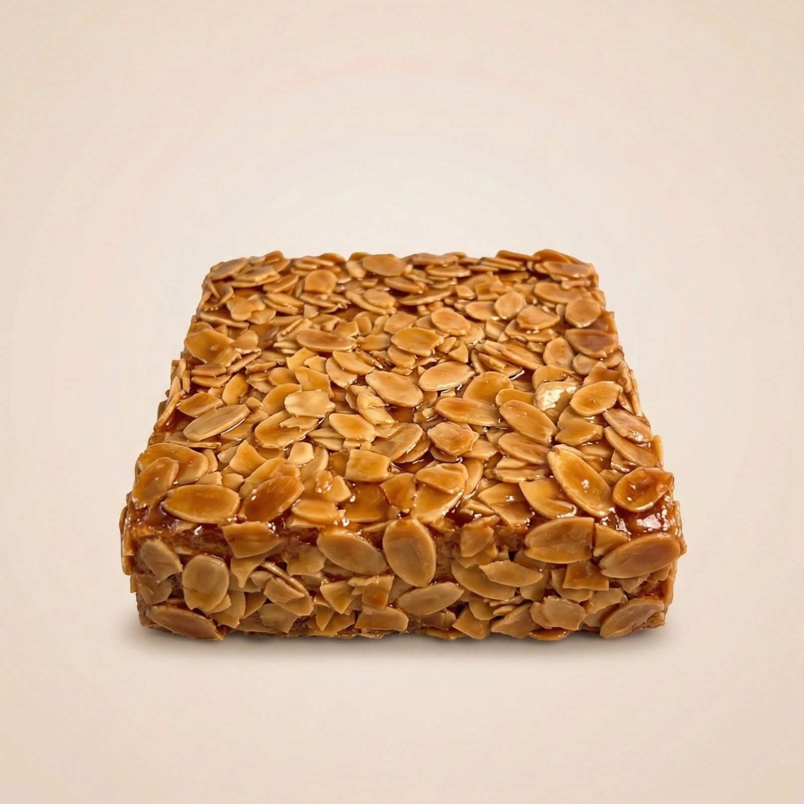 La cobertura de almendra laminada caramelizada aporta un contraste perfecto de textura y un sabor tostado que eleva cada bocado.
